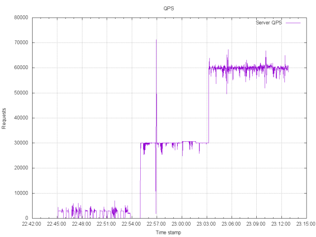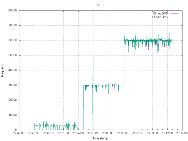 利用客户端的 HTTP 接口,将所有的客户端 QPS 调整到 6 万,让客户端发出 6W QPS 强度的请求。