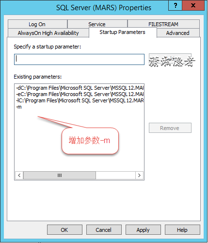 在SQL Server配置管理器中,找到对应实例,右键单击属性,在启动参数里面增加参数-m,然后重启即可。