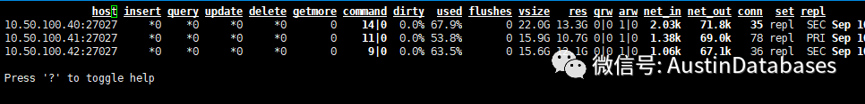 那如何通过命令行的方式,一次性的监控复制集中所有机器,并且是交换的方式 mongostat 也提供了相关的方式