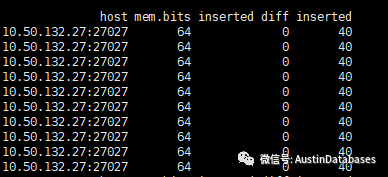 当然如果你觉得这个命令在查看一些对比上一条数据之间有多少差异的数据时比较麻烦,你可以使用 MONGOSTAT 提供的 diff 命令来满足你的需求-o 'host,mem.bits,metrics.document.inserted.diff()=inserted diff,metrics.document.inserted=inserted'