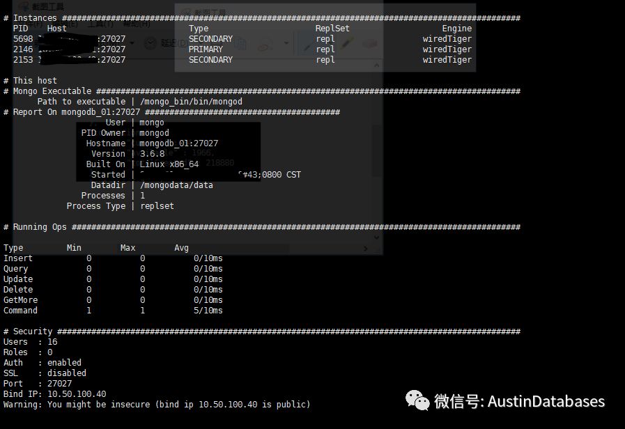 当然如果你在初接手mongodb 或集合的情况下,你也可以使用 pt-mongodb-summary (需要安装 PT 工具),来对你当前的服务器或者复制集进行一个扫描,获得一些基本的信息。