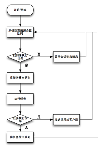 当代理线程数量大于当前会话数量时,每一个会话能够实时分配到一个代理线程,所有的任务则并发执行,不存在相互的优先关系。