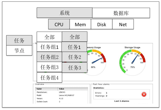 每一级别的监控分别监控给定级别的CPU、内存、磁盘、网络、以及数据库,具体包括: