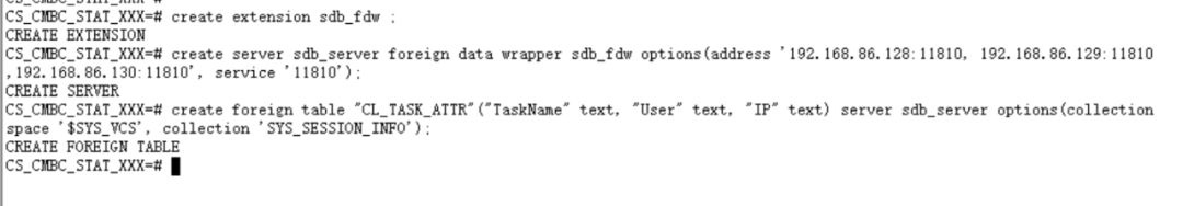 create extension sdb_fdw ;create server sdb_server foreign data wrapper sdb_fdw options(address '192.168.86.128:11810, 192.168.86.129:11810,192.168.86.130:11810', service '11810');create foreign table "CL_TASK_ATTR"("TaskName" text, "User" text, "IP" text) server sdb_server options(collectionspace '$SYS_VCS', collection 'SYS_SESSION_INFO');