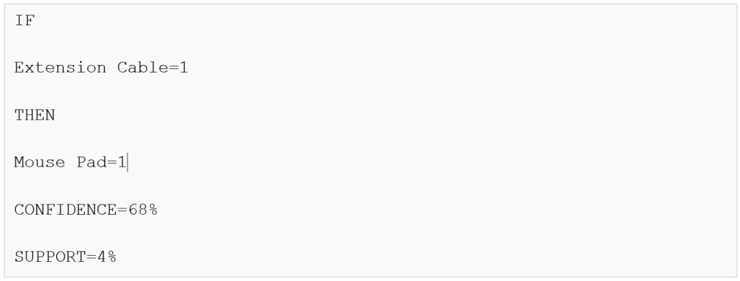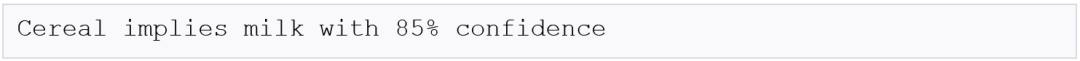 关联规则指出一个项目或一组项目以某种概率暗示另一个项目的存在。关联规则通常用于分析销售交易。例如,可能注意到,在杂货店购买谷物的顾客经常同时购买牛奶。实际上,关联分析可能会发现,包括谷物在内的结帐会话中有85%还包含牛奶。这种关系可以表述为以下规则。