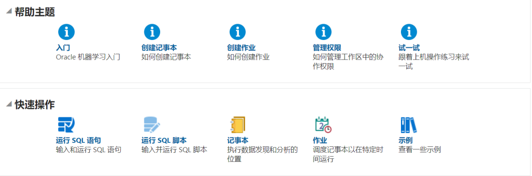 Oracle ADW中内置了Machine Learning SQL 记事本 (Notebook) ,它是基于 Apache Zeppelin 的是SQL 记事本界面,支持数据科学家和数据分析师在 Oracle ADW中执行机器。登录Oracle ADW机器学习,点击进入记事本(Notebook)。