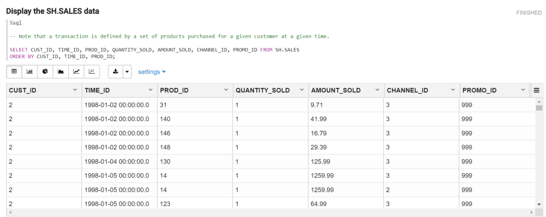1.查看电脑配件销售数据表SH.SALES(电脑配件销售数据表),可以看到数据中包含CUST_ID,TIME_ID,PROD_ID,QUANTITY_SOLD,AMOUNT_SOLD,CHANNEL_ID,PROMO_ID信息。