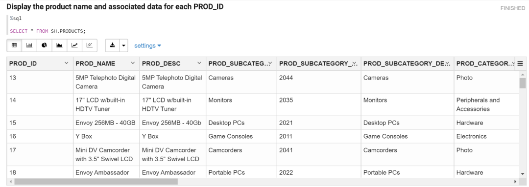 2.从SH.PRODUCTS表里查看数据,以PROD_ID显示产品之间的关联,可以看到PROD_ID,PROD_NAME,PROD_DESC,PROD_SUBCATEG等信息。