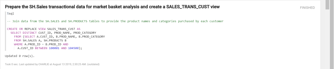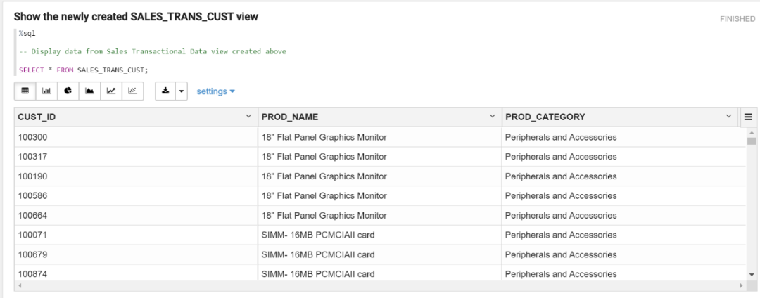 4.验证SALES_TRANS_CUST数据,是我们想要的数据,包含CUST_ID,PROD_NAME,PROD_CATEGORY。