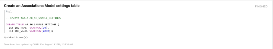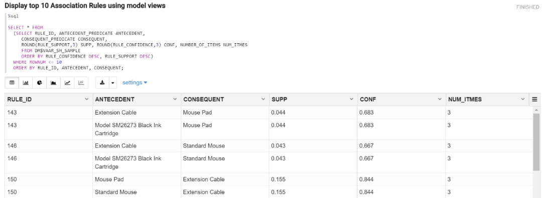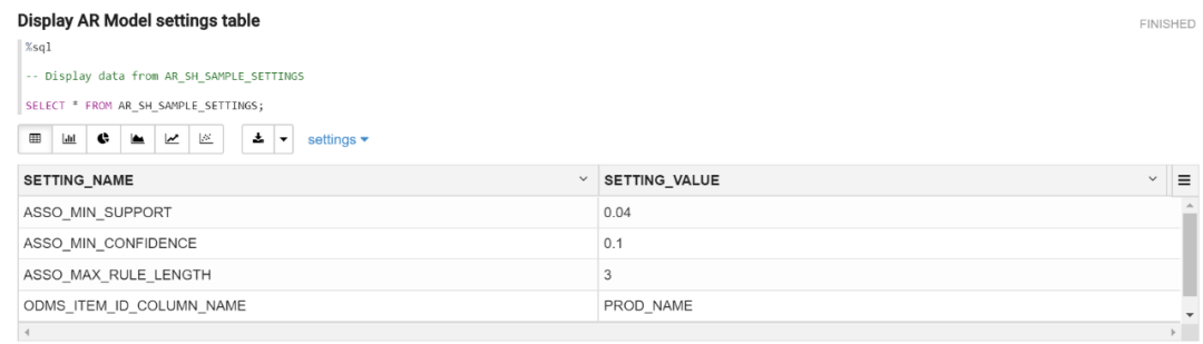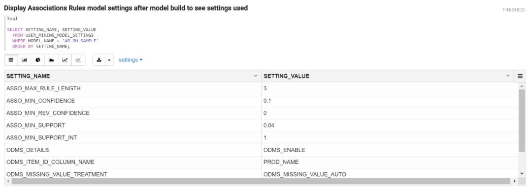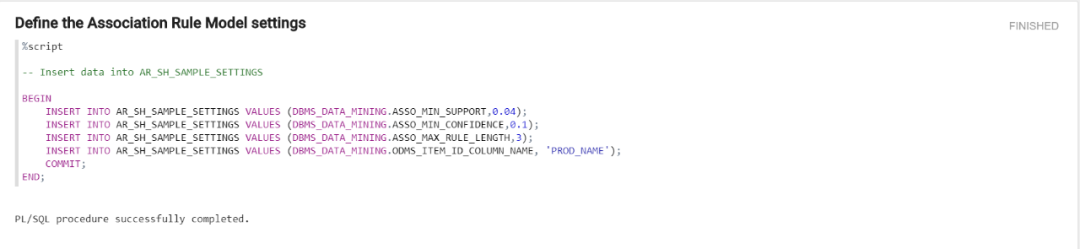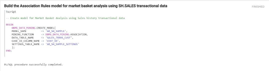 8.通过SH.SALES表数据建立购物篮关联分析模型AR_SH_SAMPLE,包含MODEL_NAME,MINING_FUNCTION,DATA_ID_COLUMN_NAME,SETTINGS_TABLE_NAME。