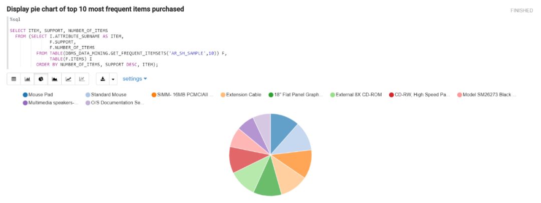 10.关联模型已经建立好,下面我们通过AR_SH_SAMPLE模型分析结果:显示TOP 10个最受消费者欢迎的商品以饼图显示。畅销产品有Mouse Pad,Mouse等。具体如下图所示: