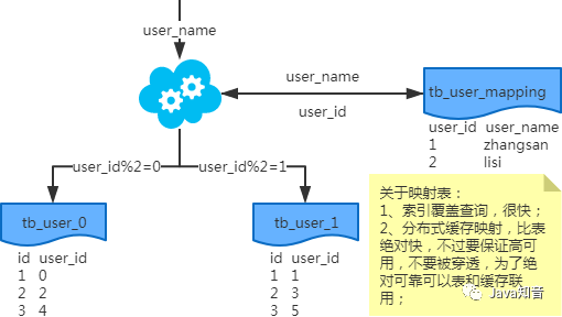根据user_name查询时,先通过user_name_code生成函数生成user_name_code再对其取模路由到对应的分库或分表。id生成常用snowflake算法。