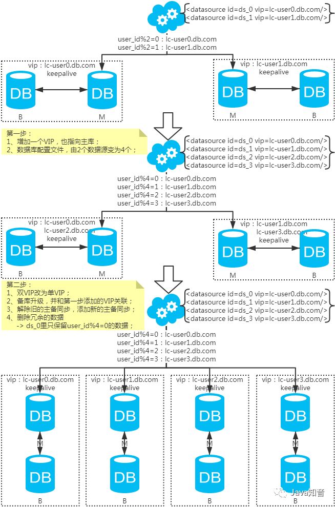 根据容量(当前容量和增长量)评估分库或分表个数 -> 选key(均匀)-> 分表规则(hash或range等)-> 执行(一般双写)-> 扩容问题(尽量减少数据的移动)。