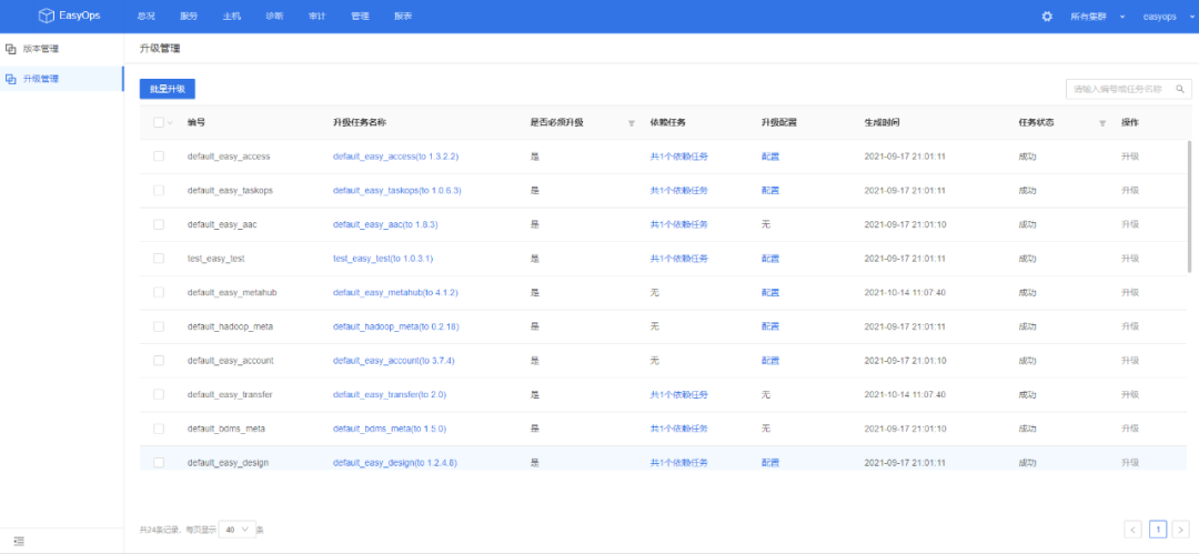 目前像网易有数早期通过amabari部署的集群,支持将该集群原地升级到easyops集群中,这样省去了用户去重新部署集群,迁移数据,迁移任务等操作。