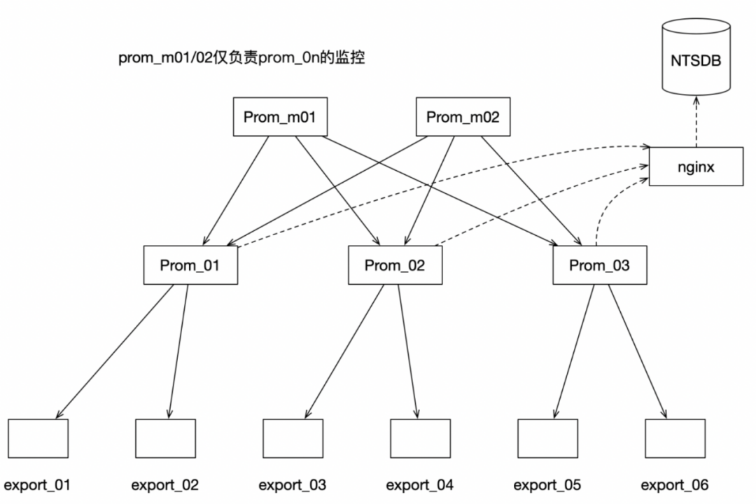 Prom_m01/02:仅监控prom_0n的状态数据,不拉取各个prom_0n所存储的监控数据。如果监控的prometheus子服务挂掉,会触发生成相同配置的子服务逻辑,保证其子服务的高可用