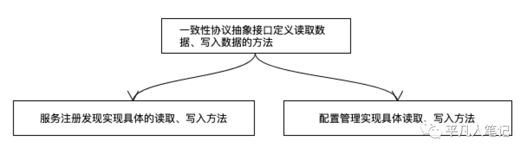 仅做完一致性协议抽象是不够的,如果只做到这里,那么服务注册发现以及配置管理,还是需要依赖一致性协议的接口,在两个计算模块中耦合了带状态的接口;并且,虽然做了比较高度的一致性协议抽象,服务模块以及配置模块却依然还是要在自己的代码模块中去显示的处理一致性协议的读写请求逻辑,以及需要自己去实现一个对接一致性协议的存储,这其实是不好的,服务发现以及配置模块,更多应该专注于数据的使用以及计算,而非数据怎么存储、怎么保障数据一致性,数据存储以及多节点一致的问题应该交由存储层来保证。为了进一步降低一致性协议出现在服务注册发现以及配置管理两个模块的频次以及尽可能让一致性协议只在内核模块中感知,Nacos这里又做了另一份工作——数据存储抽象