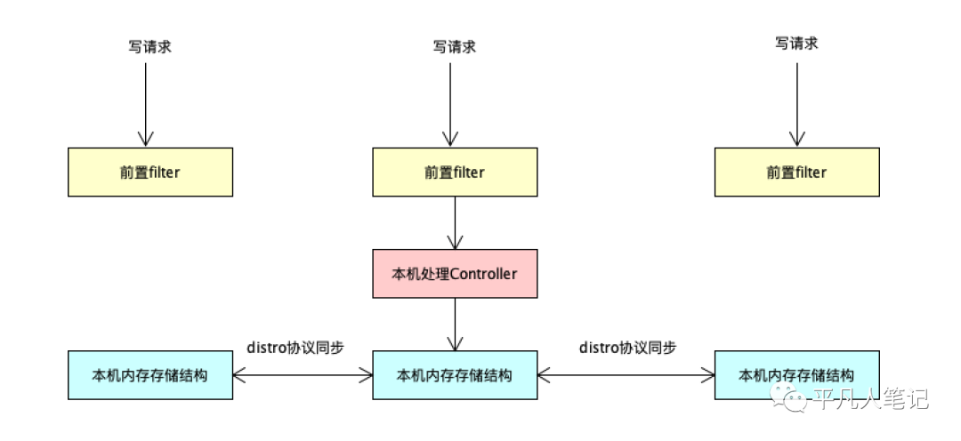 对于一个已经启动完成的Distro集群,在一次客户端发起写操作的流程中,当注册非持久化的实例的写请求打到某台Nacos服务器时,Distro集群处理的流程图如下