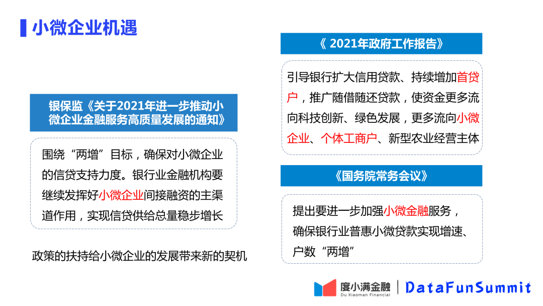 近年来,政府不断出台新的政策支持小微的信贷,尤其是今年,2021年政府工作报告,国务院常务会议以及银保监关于小微企业金融服务高质量发展通知,都提到小微企业金融贷款实现增速和户数“两增”的目标,在政策的支持下,小微企业的融资将会变得更加便利,融资成本将稳中有降,给小微企业带来新的发展契机,同时也给金融机构还有一些金融科技企业带来了新的机会和挑战。