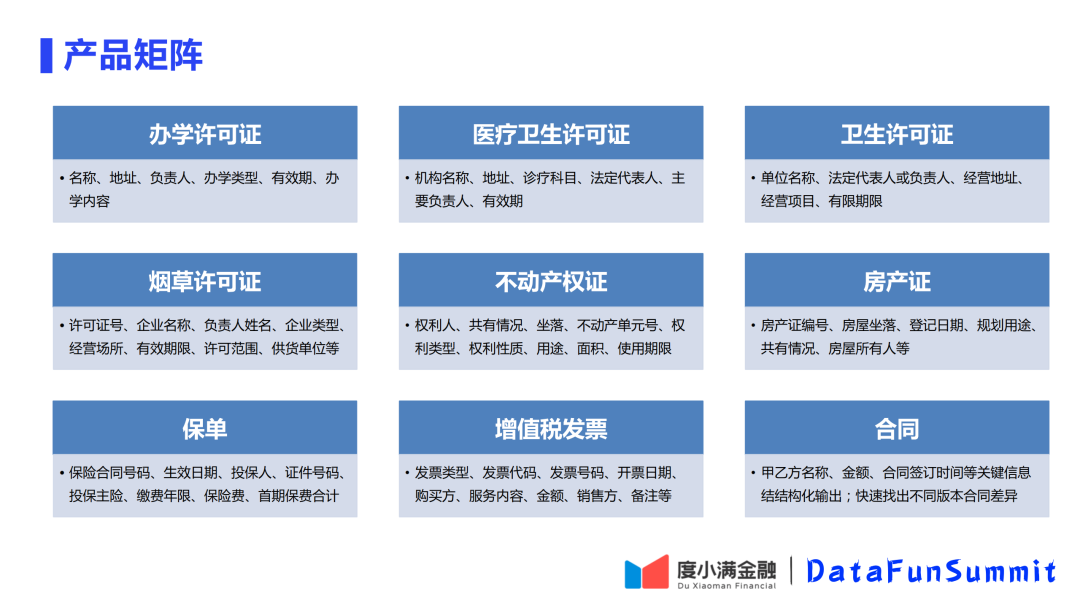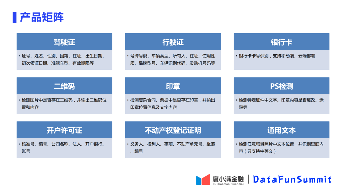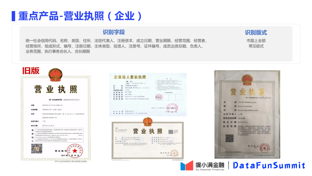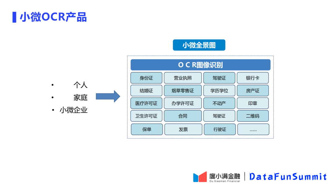 围绕个人、家庭和小微企业,在实名、绑卡、企业认证、材料提交环节中,我们借助OCR技术,构建了全流程的小微OCR产品,重点包括了身份证、驾驶证、行驶证、营业执照、保单等,涉及到小微企业的多个方面。