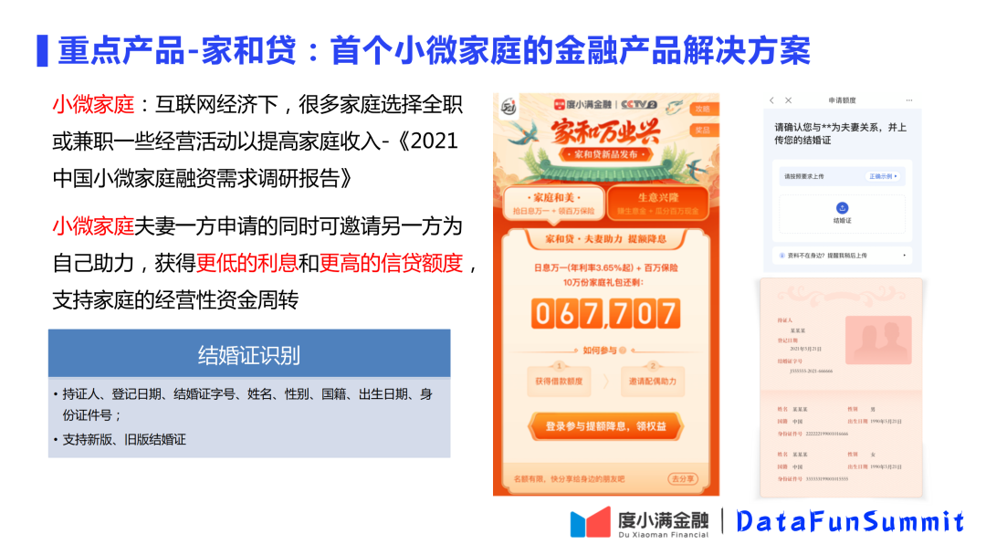 借助人工智能、大数据风控,度小满推出了首个家庭小微的金融产品——家和贷。当小微家庭夫妻一方申请的同时,可邀请另一方为自己助力,即可获得更低的利息和更高的额度,在夫妻关系认定中,需要上传结婚证,并进行OCR识别,识别的内容包括持证人、登记日期、结婚证字号、姓名、性别、国籍、 出生日期、身份证号等,同时支持新版和老版的结婚证识别。目前结婚证识别的准确率在95%以上。