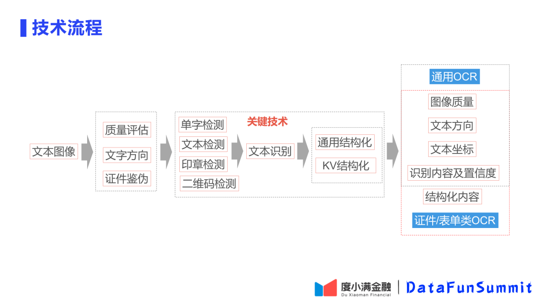 OCR完整的流程是:一张文本照片进来,我们会判断其质量、文字的朝向,并针对特定证件进行鉴伪,随后通过检测、识别、结构化等关键技术后,根据需求输出不同的结果,对于通用场景,输出文本位置坐标、文本内容及置信度等信息,对于证件、表单等用户关心的字段,会输出其对应的关键信息。
