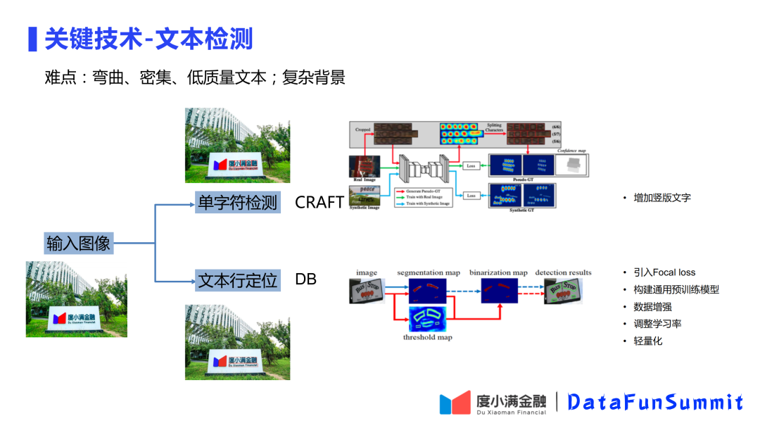文本检测就是检测出文本图像中文本行的位置。弯曲、密集文本,复杂背景下,文本检测仍然存在一些难点。针对业务需求,我们采用了单字符检测和文本行定位相结合的方案。