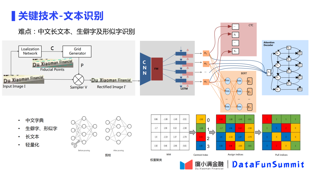 在这个过程中,针对中文识别,我们将字典扩充到16,000多个,使得我们能支持正常业务上内容的识别。针对生僻字、形似字以及训练样本不均衡的问题,我们构建了一套数据合成方案。针对长文本,我们做了两个方面优化,第一个就是结合单字符检测模型,首先将整个长文本或者超长文本通过单字符检测模型定位出单字位置,并判断出字符数量,然后再按照一定数量进行切割后,再用通用的文本识别模型去识别,大大的提升了长文本识别的准确率。在轻量化方面,我们采用剪枝和权重聚类等手段,将银行卡识别模型压缩在80K左右,可以直接用于移动端的部署。