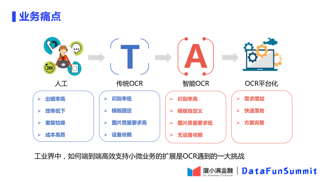 传统OCR释放了少量的人力成本,智能OCR解决识别率的问题,但是随着小微等其他业务的快速增长,会涉及到成百上千种资料识别,有时候这些场景前期甚至没有任何数据,因此需要一套完整的解决方案来实现业务落地,将整个流程平台化,让业务和开发者更好的关注需求,简化对模型和数据的依赖。