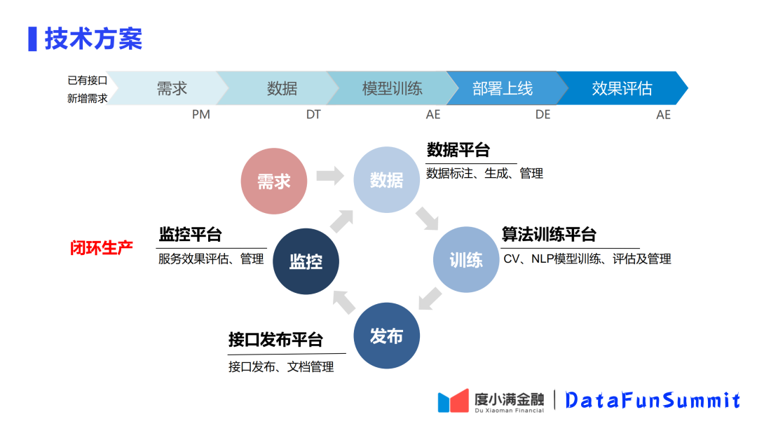 基于串行的业务痛点,我们设计了闭环生产的全流程,包含需求、数据、训练、发布、监控: