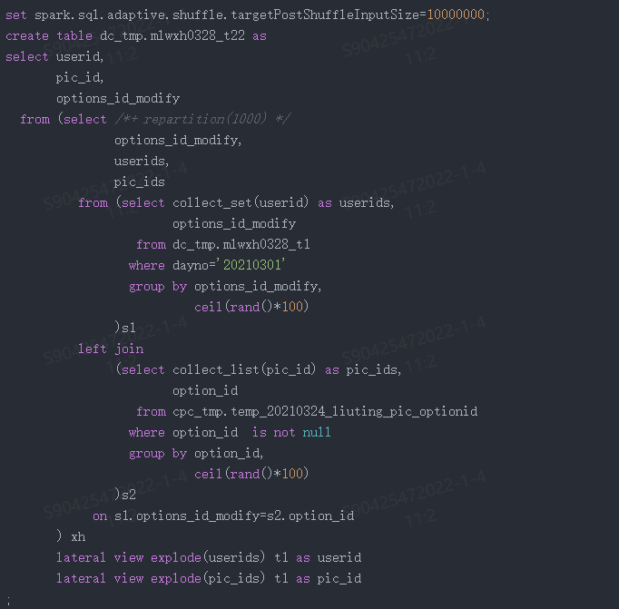 •代码里的hint(repartition(1000))的作用是考虑到经过collect_list聚合后的数据单行携带的数据经过一行变多行的展开操作后会膨胀很多倍,因此单个任务处理的数据量必须很小,才能保证处理速度够快。这个hint的作用是告诉系统将上一阶段关联后的结果分成1000份,交给下游处理;