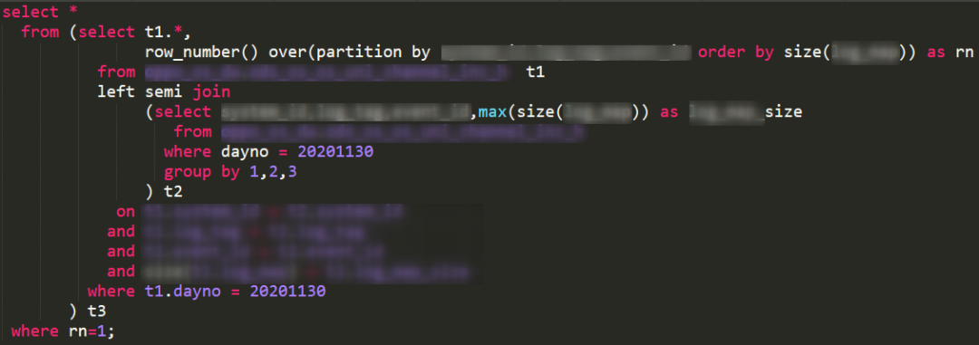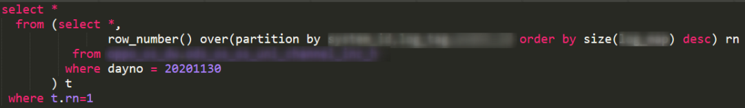 稍微解释一下SQL的意思:希望取出上报数据里针对某个维度组合的一条内容较为丰富的样本数据,因此以某字段的size作为降序排序并取结果的第一条。
