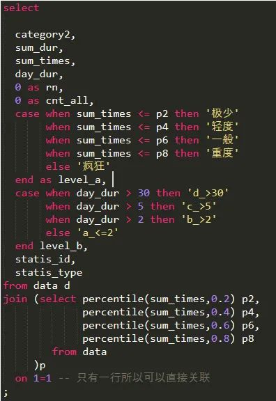 注意上述代码有个小技巧,即与只有一行的子查询结果进行笛卡尔积关联,从而变相的实现了引入p2到p8等4个变量的效果,还算实用。