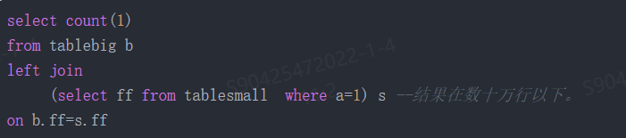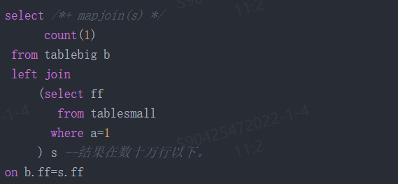 要让执行计划改成广播s子查询结果,加hint mapjoin (也可以是 broadcast)就可以了。