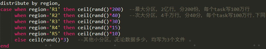这部分简要描述一下。在动态分区场景下,我们常常很难预料最后每个分区将要输出的数据量会是多少,但分配的task数量对于每个最终分区都是固定的。以国家分区条件为例,印尼这个分区如果是输出10亿行,而新加坡只输出100万行,这个时候如果我们只分配2个任务去写数据,印尼这个分区单个任务会承受1亿行的任务,会非常慢。而如果设置为100个任务来写数据,对印尼这个分区来说是比较合适的,但新加坡这个分区分产生100个小文件,对后续的文件操作和未来下游任务的读取都有消极的影响。最后经过实践后,找到一个比较好的办法。即找出倾斜的分区key,通过distribute by + case when表达式,让引擎对不同的分区做不同数量的数据分发。具体代码(以region为动态分区字段):