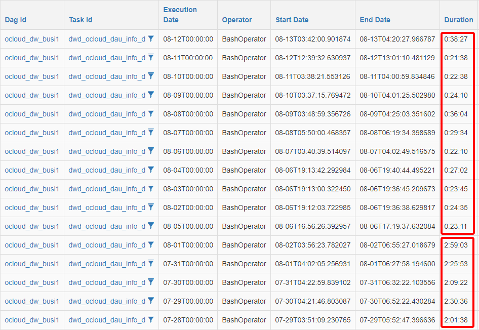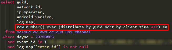 u_info_d任务的时候,我们发现任务的运行时间一直在增长,一度达到7个小时,直到8月1号便再也跑不成功,总是OOM(内存不够),即使将executor的内存调高到10G依然解决不了问题。经过仔细诊断,发现任务慢在一个开窗函数阶段,代码如下: