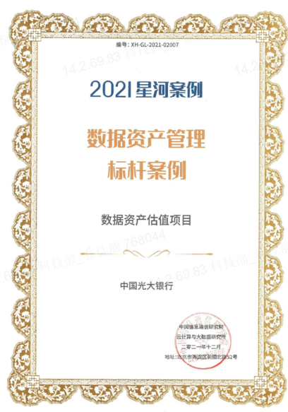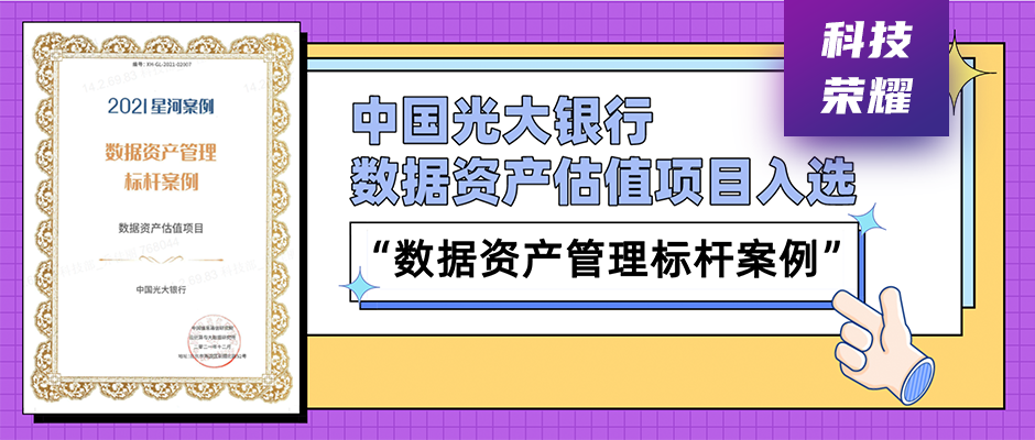 近日,由中国信息通信研究院和大数据技术标准推进委员会(CCSA TC601)共同组织的“2021星河案例”评选结果出炉,中国光大银行数据资产估值项目入选“数据资产管理标杆案例”。