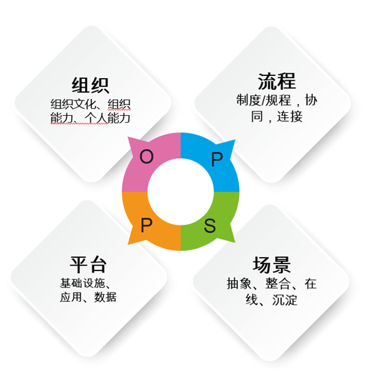 从我们前期数字化实践经验看,大到公司体系、部门体系,小到团队/群组体系,其数字化转型的运营管理架构由“组织(organization)、流程(process)、场景(scene)、平台(platform)”四部分组成(见图1),我们简称为OPSP。OPSP的体系架构中,组织重点围绕组织文化、组织架构、岗位设置、个人能力建立数字化管理能力。流程是通过数字化思维重塑工作流程,将制度规范、管理领导力、协同模式、资源配置等在线化。场景是将线上工作“人、事、时间、协同、环境”连接起来,实现提能增效和智慧沉淀,场景需配套有效的技术控制机制,以确保业务及运营管理在合规、风控的基础上更高效开展。平台是支撑组织、流程和场景数字化落地的技术底座。