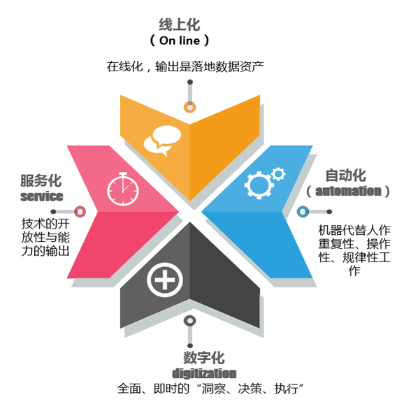 科技条线的“客户服务、连续性保障、快速交付、生态扩展、IT服务、运营协同”6大IT能力建设是呈螺旋式持续提升过程,以应对外界持续变化的复杂度和不确定性,实现在高速行驶过程中换轮子的能力。要确保IT能力建设方向的准确性,需要建立可评价的转型绩效指标,引导职能领域保持统一的方向。为此,我们以“线上化(On line)、自动化(automation)、数字化(digitization)、服务化(service)”作为评估维度来度量场景数字化转型的成熟度(见图2),简称OADS。其中,“线上化”强调线下工作在线化,输出是落地数据资产;“自动化”强调人机协同,由机器代替或辅助人做重复性、操作性、规律性工作;“数字化”强调利用数据资产实现,即更全面、即时的“洞察、决策、执行”能力;“服务化”强调技术的开放性与能力的输出。围绕OADS,我们在管理及平台建设上,要求团队以迭代的方式不断梳理并丰富工作场景,通过持续性引入或迭代更先进的平台逐步提升场景OADS程度,场景与数字化平台形成虚实结合的数字化技术体系架构。