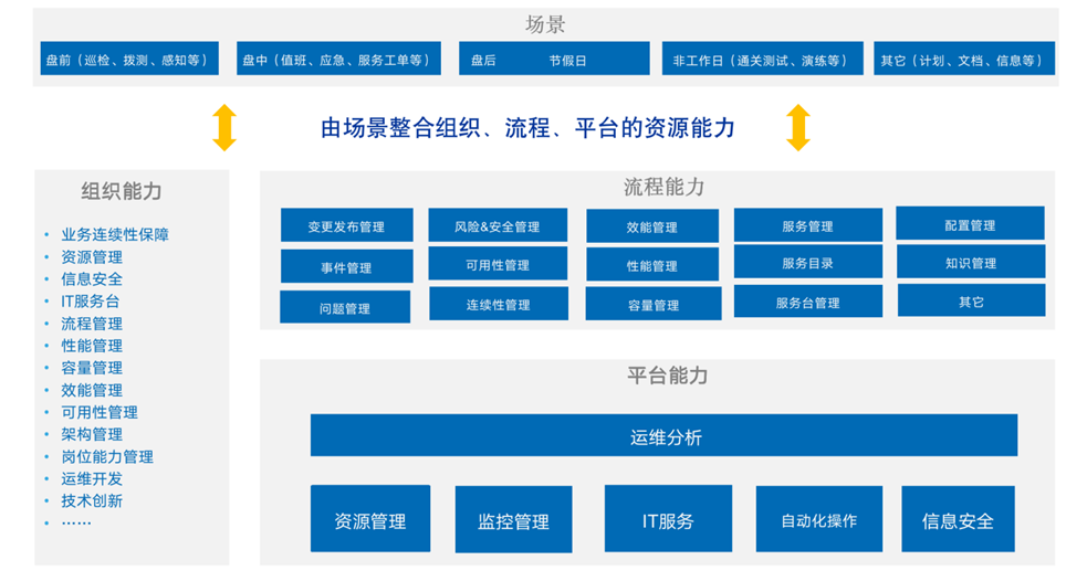 面对VUCA的复杂运维数字世界,运维面临如何支持公司在高速行驶过程中换轮子的挑战,一是让“相对稳定且能较精确预知领域”进化为更加适应数字化时代,持续的稳定;二是适应并赋能企业转型持续探索、创新,驾驭不确定性的能力,持续的敏捷。要有效落实 “增加IT风险保障能力”、“加快业务交付速度”、“提高IT运营服务质量” 、“提升客户体验”四大价值,需要从体系架构、流程机制、组织能力、平台建设、场景构建等全面建设。基于OPSP打造的数字化运维体系能力框架包括4点(见图3):(1)持续优化组织能力建设,主要以运行保障、业务可用性\连续性管理、资源管理、信息安全等为基础,扩展到流程经理、运营分析、IT服务、系统退出、运维开发等横向能力,建立学习型组织文化,推动组织个人能力的持续提升。(2)以敏稳双态优化流程能力,吸收devOps、AIOps、SRE、ITOA、ITIL等方法论,结合“连接、数据、赋能”思维,由被动的流程管理向主动型的IT服务、IT运营转变。(3)围绕时间角度,建立“盘前、盘中、盘后、节假日”的运维场景,打造人、事、时间、协同、环境为一体的线上场景,整合协同资源。(4)推动“监、管、控、析”工具体系向一体化平台架构演进,利用自动化手段替代手工操作环节,推动运维研发一体化,并利用运维数据中台及运营场景,推动数据运营,探索运维智能化。