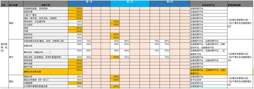 要确保运维数字化建设方向正确,所有场景的实施都需围绕运维4个核心价值创造来落地,让我们聚焦有限的资源做更有价值的事,比如图5是围绕“增加IT风险保障能力”这个价值创造的场景地图。围绕场景地图,流程经理牵头优化流程机制及操作规程,应用运维优化业务连续性保障的可观察、应急保障等能力,运维研发团队落地场景的研发与运营推广、基础设施团队加强IAAS及PAAS平台的健壮性、弹性。
