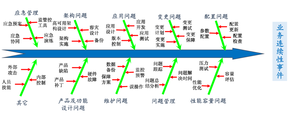 运维场景是每个运维团队沉淀下来的宝贵知识,不同企业的运维团队场景各有不同,场景融汇了团队在组织、流程、平台方面的智慧,数字化运维需要用“连接、数据、赋能”的数字化思维重新将运维沉淀下来的智慧场景化。以IMS(事件管理)应急管理场景作为例,是我们数字化运维场景中横贯所有时间段的运维场景之一,是 “提升业务连续性”价值的关键措施。随着新技术引入,业务逻辑日逾复杂,软件迭代速度加快,以及外部日益严峻形势,影响业务连续性的因素越来越多,我们采用鱼骨图梳理了影响业务连续性因素(见图6)。