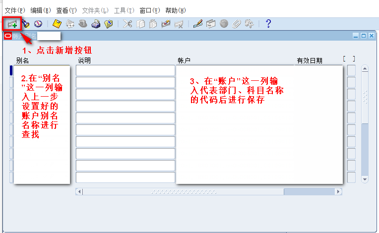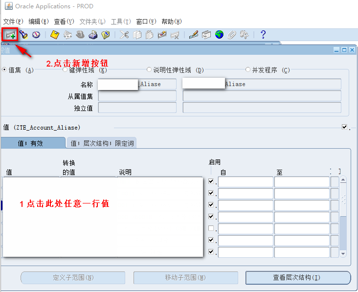 在账户别名值集页面任意选择一行,点击新增按钮,“值:有效”处会出现新的一行,输入账户别名值集名称。保存关闭即可。