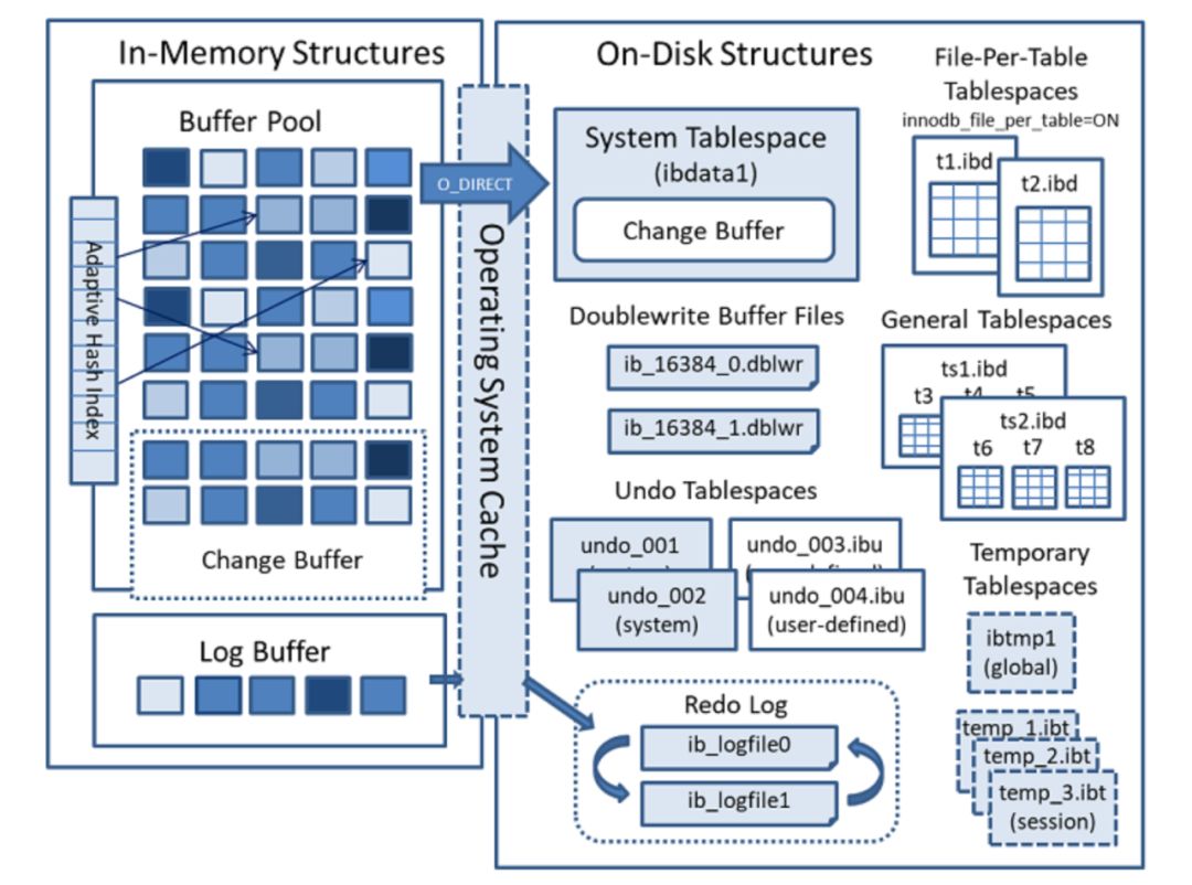 当应用程序,或者通过客户端执行一个查询时,首先要做的就是创建一个连接,当查询通过连接到达MySQL时,要对其进行解析。解析过程包括,将查询拆分并标记,以便知道查询的类型,并且会使用一个列表,里面包含查询所需的表和列的信息,这个列表会在下一步使用。接下来,MySQL会检查该用户是否有对列表里的对象执行操作的权限。通过权限检查后,查询将进入优化器,优化器会涉及重写查询、决定表的访问顺序,以及使用哪些索引等工作。实际的执行步骤包括从存储引擎层请求数据。每个存储引擎处理的方式可能不同。InnoDB包括一个缓冲池,用于缓存数据和索引、重做和撤消日志、其他缓冲区以及表空间文件。如果查询返回结果,结果将通过SQL层从存储引擎发送回应用程序。关于InnoDB的架构,请参考下图,详细的过程今后找机会介绍: