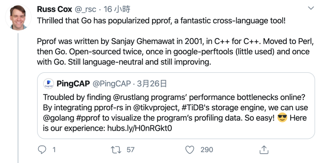 大家在对 C/C++ 的程序寻找性能瓶颈的时候,经常用到 perf 工具,但是原生的 perf 对于 Rust 支持并不完全(例如 Rust 的闭包),于是我们开发并开源了针对 Rust 程序的分析器:pprof-rs,并原生集成到 TiKV 中,如果熟悉 Go 语言的同学,根据这个项目的命名就知道,这个项目受到了 Go 语言的 pprof 的影响。没错, pprof-rs 能支持直接输出 pprof 格式的数据文件,也就是可以直接用 pprof 来可视化分析 pprof-rs 的采样数据,这能很大地帮助用户在生产环境中快速定位 TiKV 的性能问题。https://pingcap.com/blog/quickly-find-rust-program-bottlenecks-online-using-a-go-tool/https://github.com/tikv/pprof-rspprof 的技术详解博客在发布之后随即引发了广泛关注,Go 语言创始人之一 Russ Cox(rsc)也转发了该文章:48 小时完成开源电子书 <TiDB in Action>