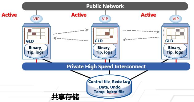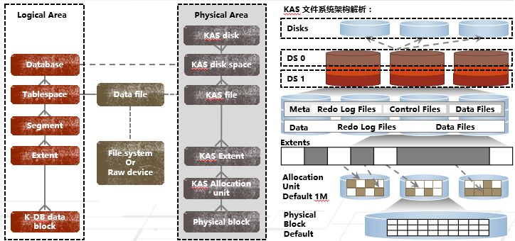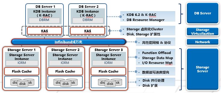 在 K-RAC集群架构中, KAS首先替代了第三方集群管理软件的作用,数据库对于存储的并发访问需求,均有KAS实例协调处理。另一方面,KAS通过数据的冗余、条带化、重分布等技术,极大地提升了数据库集群的稳定性及管理便利性,同时也极大便利了数据空间的扩展。