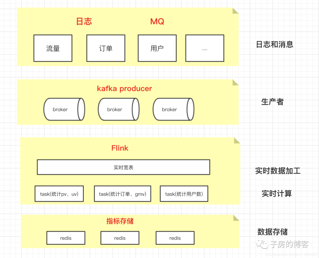 上述流程图描述了一般的实时数据计算流程,接收日志或者MQ到kafka,用Flink进行处理和计算,将最终计算结果存储在redis中,最后查询出redis中的数据给大屏、看板等展示。