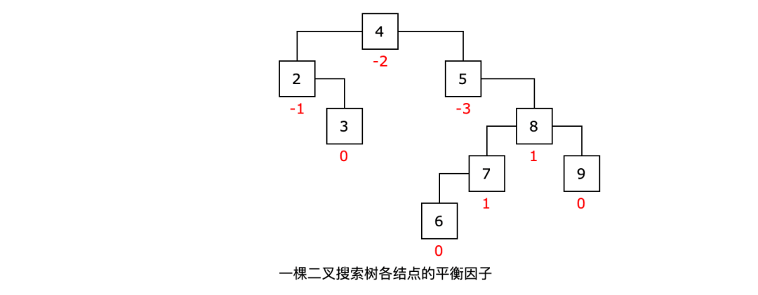 举例:8 的左子树高度为 2,右子树高度为 1,因此它的平衡因子为 1;5 的左子树高度为 0,右子树高度为 3,因此它的平衡因子为 -3;4 的左子树高度为 2,右子树高度为 4,因此它的平衡因子为 -2;