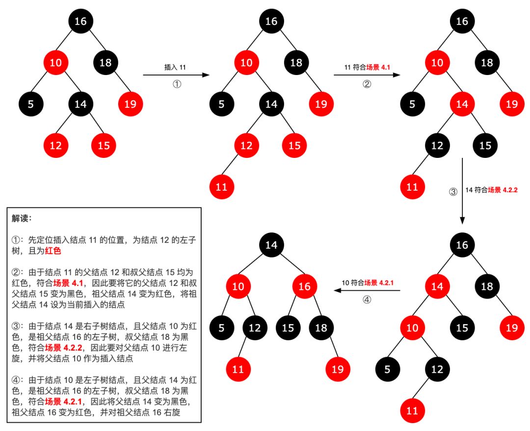 下面举个例子,往一棵红黑树中插入元素,整棵树的变换如下图所示: