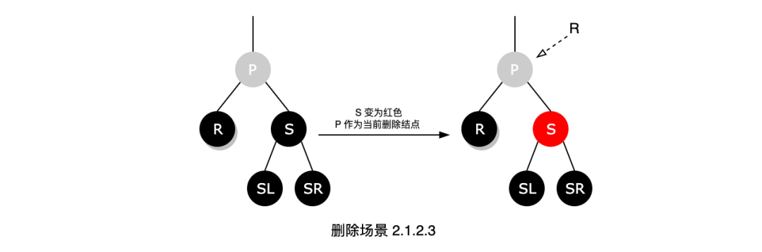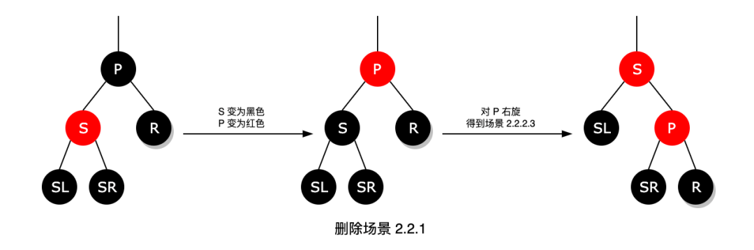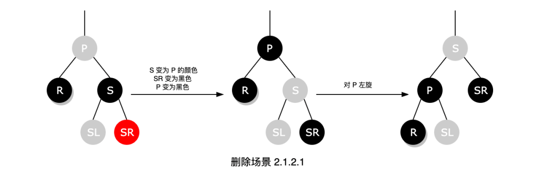 若兄弟结点是红结点,那么根据红黑树性质 4,兄弟结点的父结点和子结点肯定为黑色,按照下图方式处理,得到删除场景 2.1.2.3。