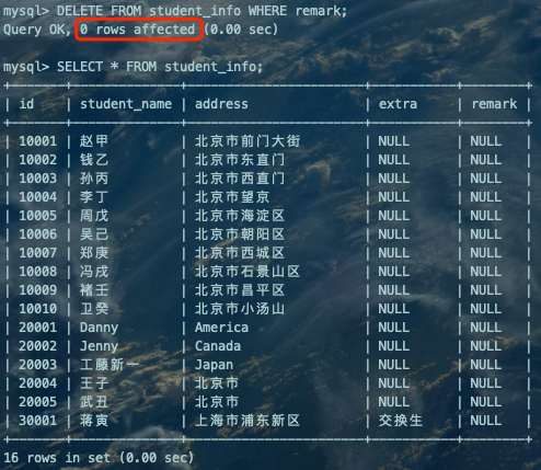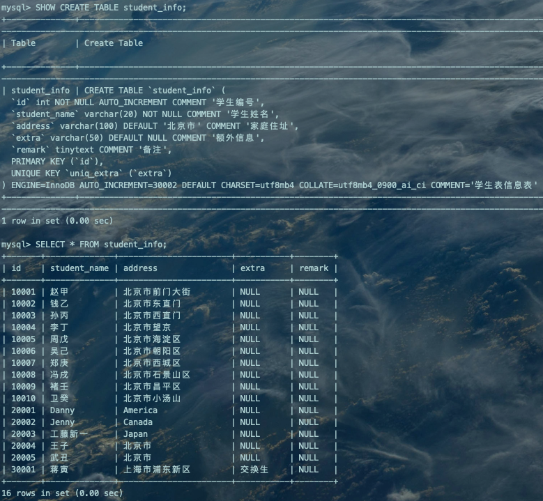 CREATE TABLE `student_info` ( `id` int NOT NULL AUTO_INCREMENT COMMENT '学生编号', `student_name` varchar(20) NOT NULL COMMENT '学生姓名', `address` varchar(100) DEFAULT '北京市' COMMENT '家庭住址', `extra` varchar(50) DEFAULT NULL COMMENT '额外信息', `remark` tinytext COMMENT '备注', PRIMARY KEY (`id`), UNIQUE KEY `uniq_extra` (`extra`)) ENGINE=InnoDB COMMENT='学生表信息表';INSERT INTO student_info (id, student_name, address, extra, remark) VALUES(10001, '赵甲', '北京市前门大街', NULL, NULL);INSERT INTO student_info (id, student_name, address, extra, remark) VALUES(10002, '钱乙', '北京市东直门', NULL, NULL);INSERT INTO student_info (id, student_name, address, extra, remark) VALUES(10003, '孙丙', '北京市西直门', NULL, NULL);INSERT INTO student_info (id, student_name, address, extra, remark) VALUES(10004, '李丁', '北京市望京', NULL, NULL);INSERT INTO student_info (id, student_name, address, extra, remark) VALUES(10005, '周戊', '北京市海淀区', NULL, NULL);INSERT INTO student_info (id, student_name, address, extra, remark) VALUES(10006, '吴己', '北京市朝阳区', NULL, NULL);INSERT INTO student_info (id, student_name, address, extra, remark) VALUES(10007, '郑庚', '北京市西城区', NULL, NULL);INSERT INTO student_info (id, student_name, address, extra, remark) VALUES(10008, '冯戌', '北京市石景山区', NULL, NULL);INSERT INTO student_info (id, student_name, address, extra, remark) VALUES(10009, '褚壬', '北京市昌平区', NULL, NULL);INSERT INTO student_info (id, student_name, address, extra, remark) VALUES(10010, '卫癸', '北京市小汤山', NULL, NULL);INSERT INTO student_info (id, student_name, address, extra, remark) VALUES(20001, 'Danny', 'America', NULL, NULL);INSERT INTO student_info (id, student_name, address, extra, remark) VALUES(20002, 'Jenny', 'Canada', NULL, NULL);INSERT INTO student_info (id, student_name, address, extra, remark) VALUES(20003, '工藤新一', 'Japan', NULL, NULL);INSERT INTO student_info (id, student_name, address, extra, remark) VALUES(20004, '王子', '北京市', NULL, NULL);INSERT INTO student_info (id, student_name, address, extra, remark) VALUES(20005, '武丑', '北京市', NULL, NULL);INSERT INTO student_info (id, student_name, address, extra, remark) VALUES(30001, '蒋寅', '上海市浦东新区', '交换生', NULL);SELECT * FROM student_info;